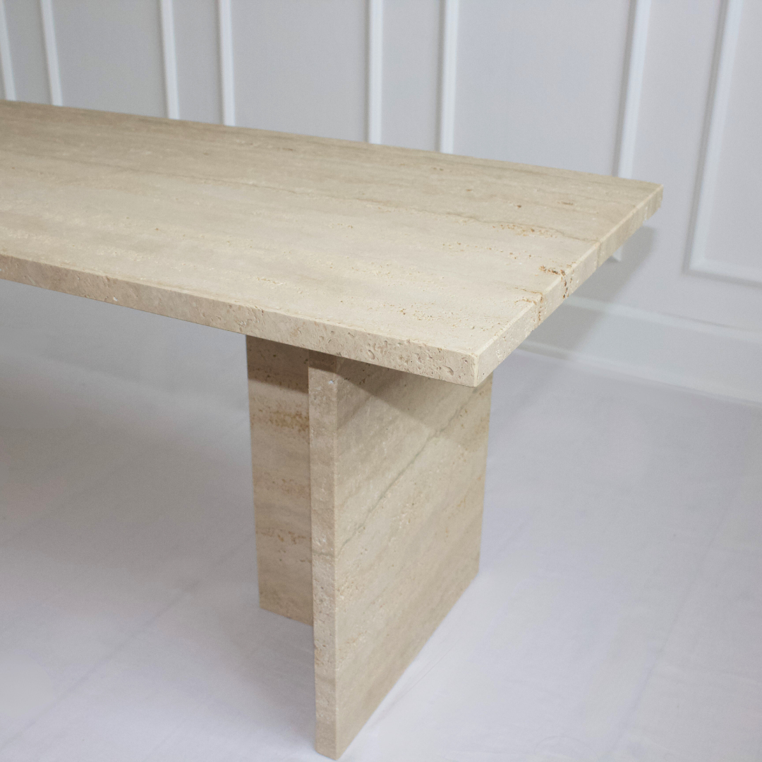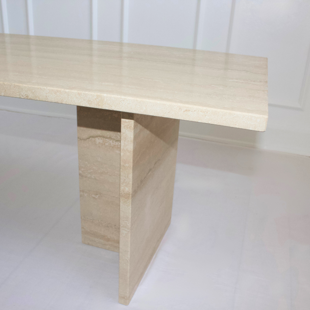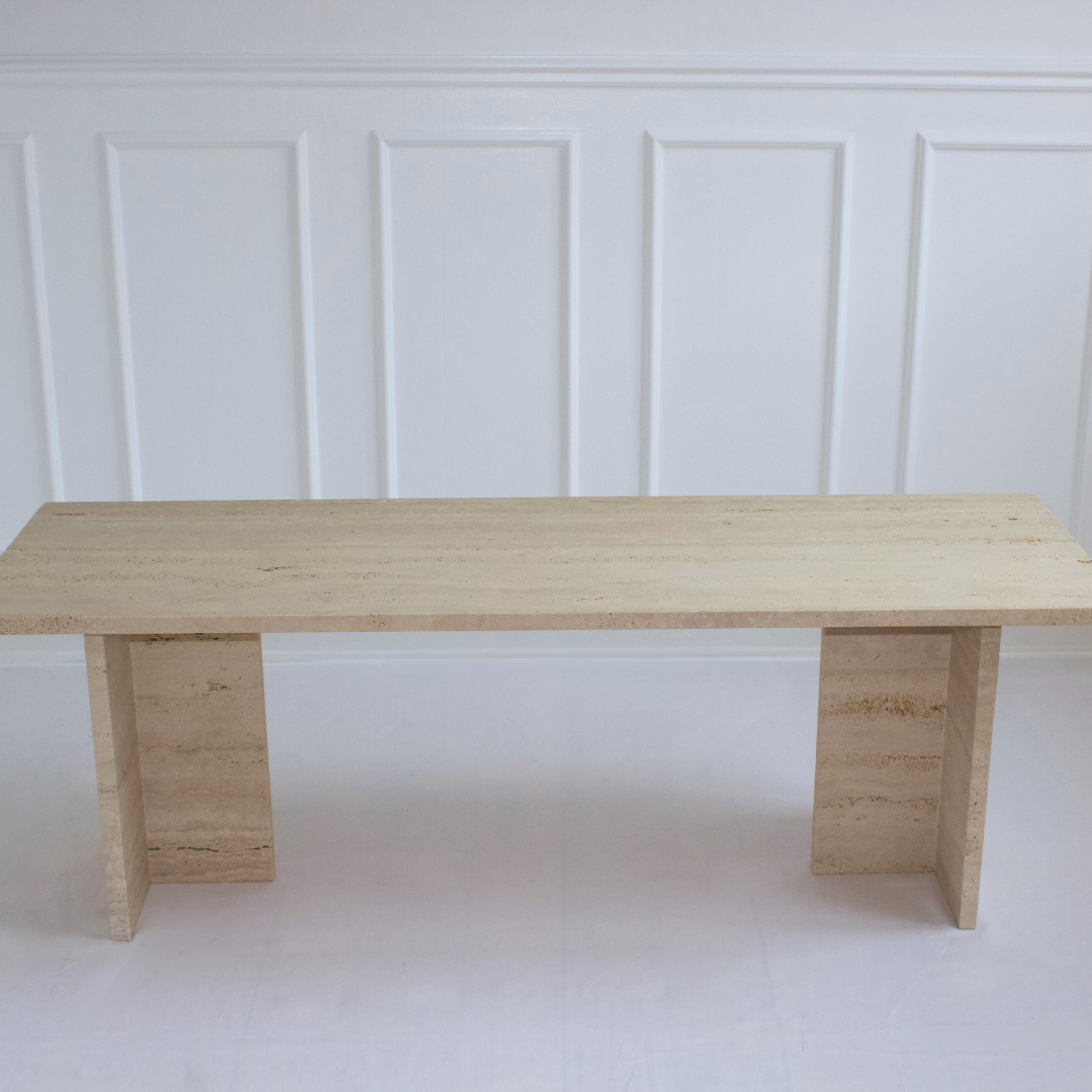 Kombinationen af en travertin bordplade og bordben skaber et udtryk, der både er råt og tidsløst.